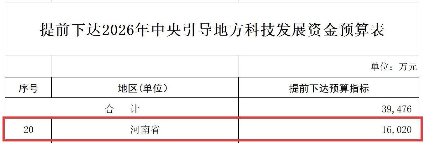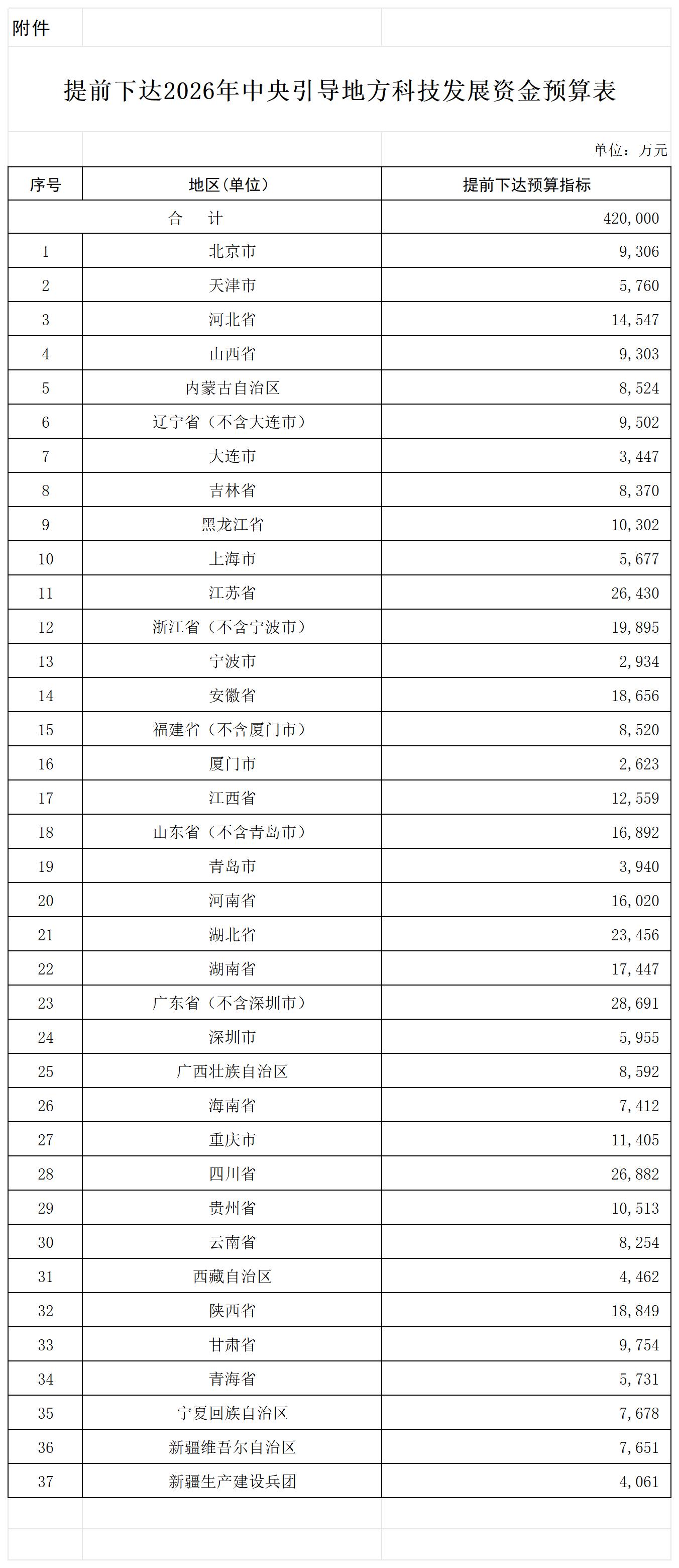 为加快预算执行进度,提高预算编制的完整性,经研究,现提前下达2026年中央引导地方科技发展资金预算指标(项目代码:10000013Z135050009017,具体见附件),统筹用于支持区域科技创新体系建设、科技创新基地建设、科技成果转移转化、自由探索类基础研究等方面。